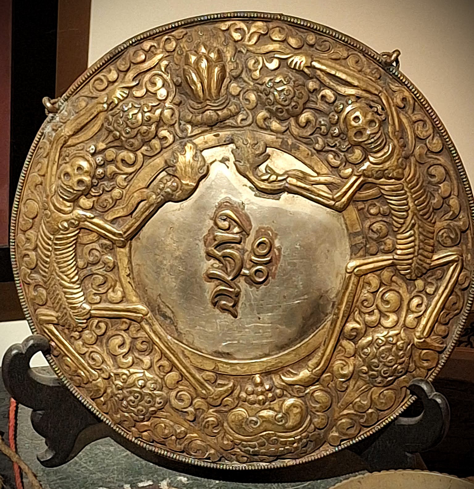 L’analyse visuelle des gravures de cette coupe révèle un répertoire iconographique typiquement himalayen et bouddhiste, souvent utilisé par les communautés Sherpa et Tibétaines. Bien que le métal soit déformé, on distingue plusieurs éléments clés :