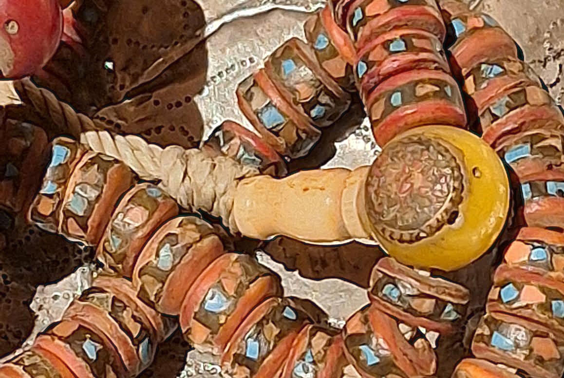 Lorsqu’une turquoise est associée au corail rouge sur un mala, comme sur ce collier, elle crée un équilibre symbolique puissant.
