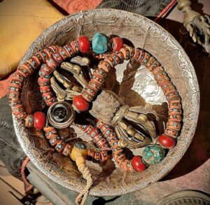 La perle proéminente à la base est une perle Dzi Luk Mik, également appelée “œil de chèvre” ou “œil magique“. Ces perles en agate naturelle rubanée sont portées comme des amulettes protectrices puissantes dans la culture tibétaine pour conjurer le mauvais sort.